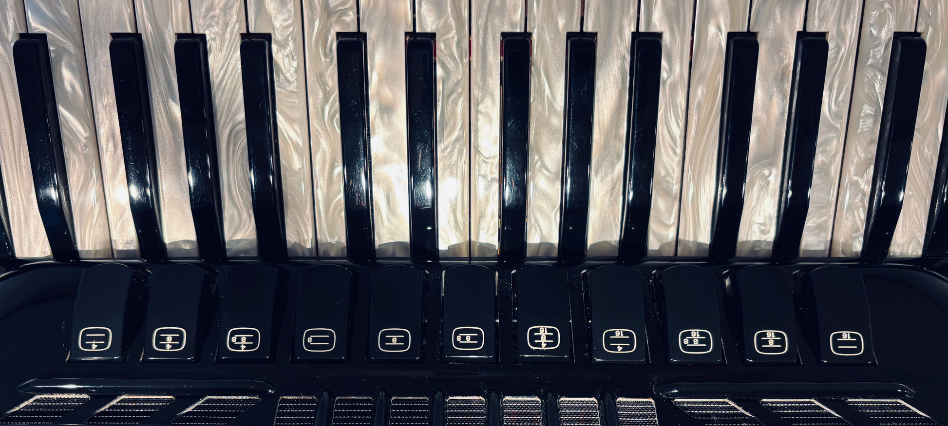 De elegante perlemorstangenter understreger harmonikaens eksklusive udtryk. Harmonikaen fremstår meget flot og velholdt, og den er naturligvis serviceret, så den er klar til brug.