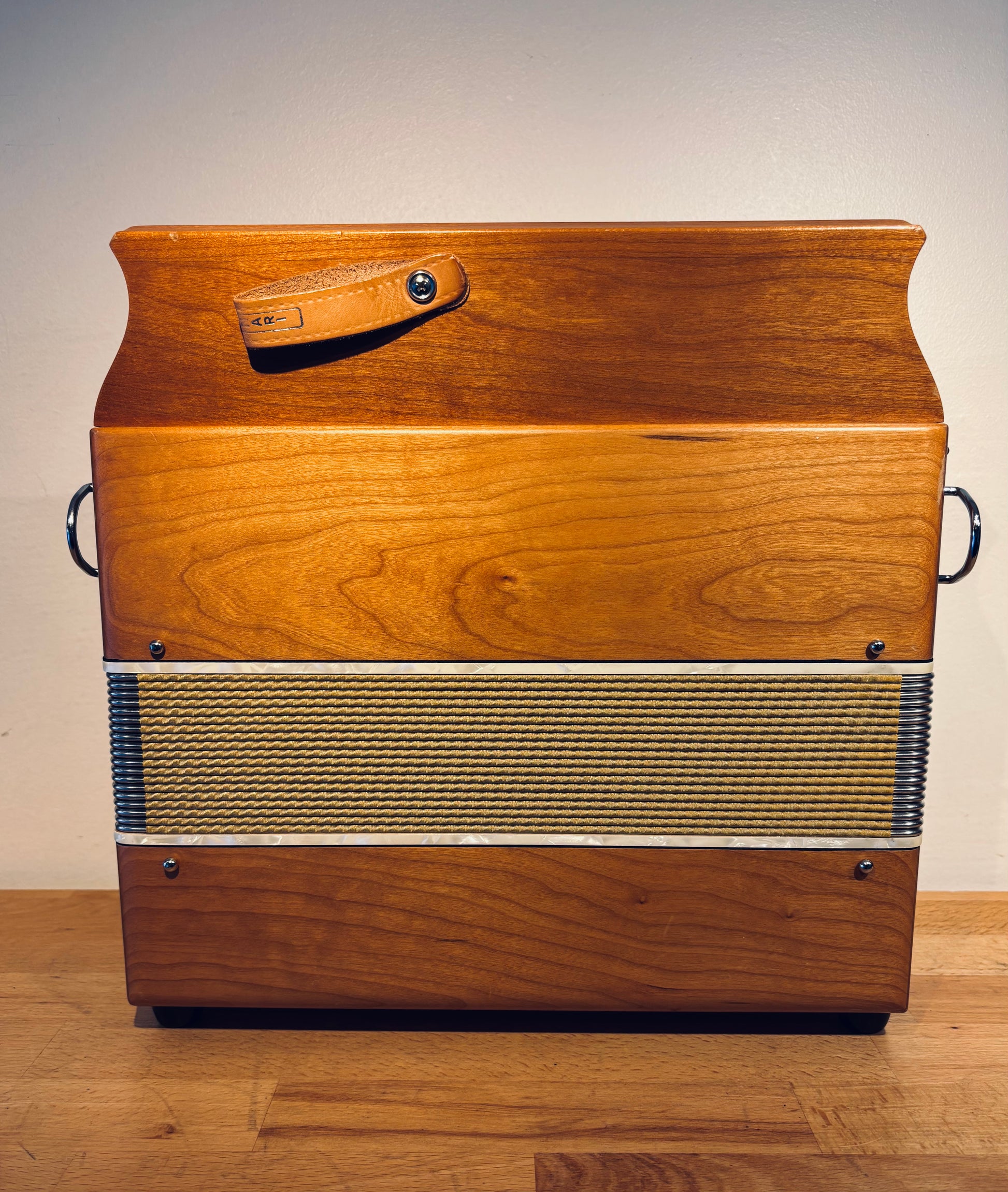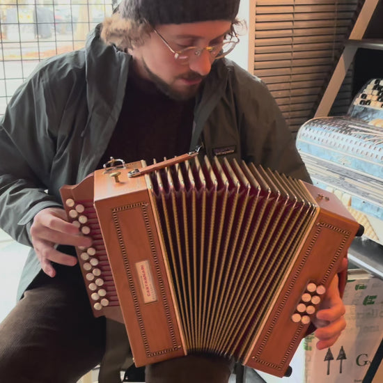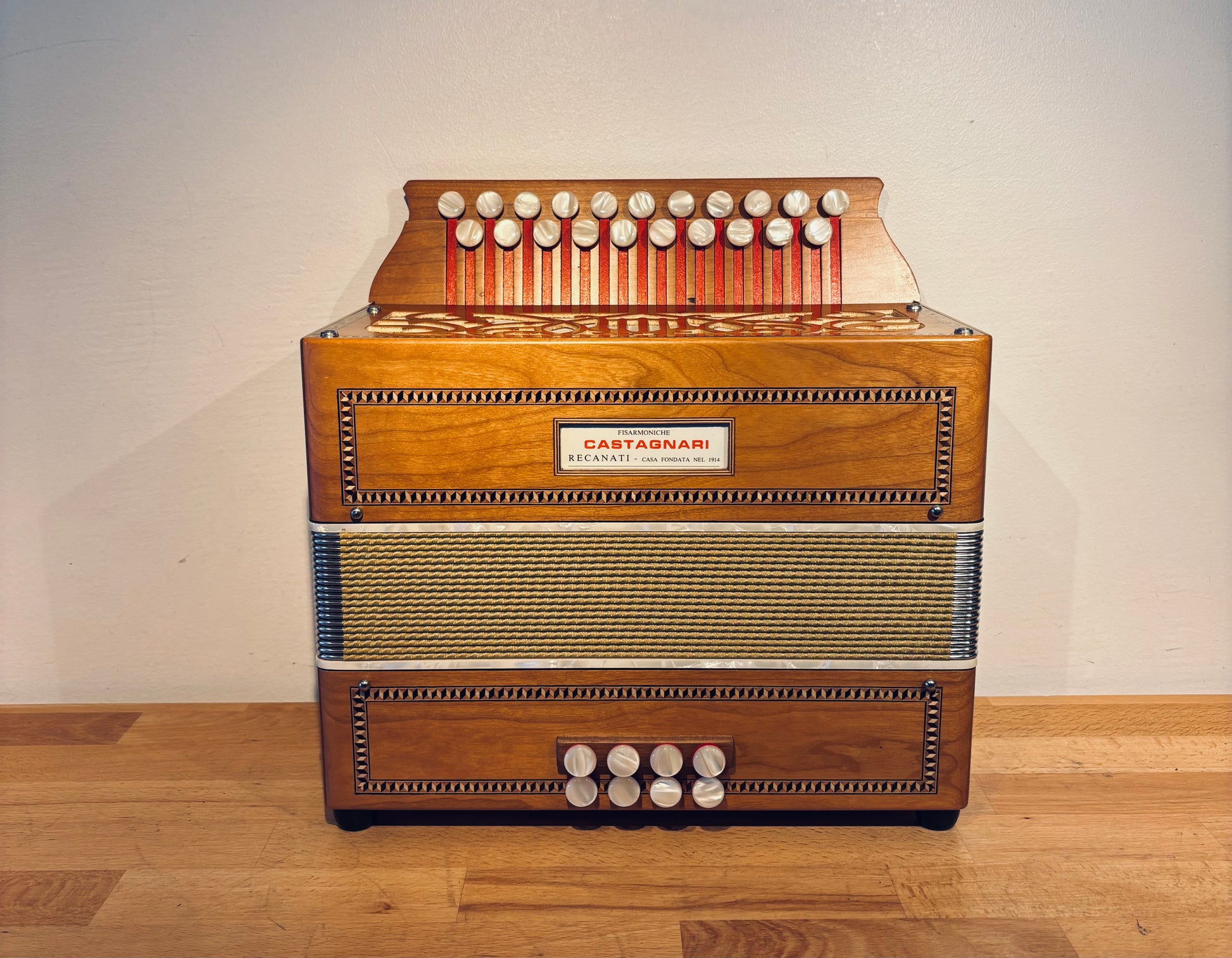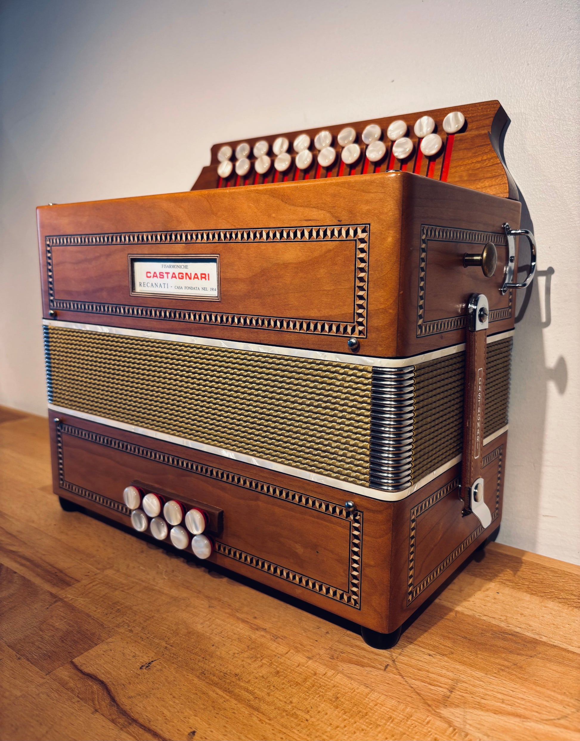 Næsten ubrugt Castagnari diatonisk harmonika, håndbygget i Recanati, Italien. Dette instrument repræsenterer italiensk traditionelt håndværk kombineret med en klar, fyldig og varm klang, som er karakteristisk for Castagnari. Harmonikaen er ideel for musikere, der ønsker høj lydkvalitet og præcision.