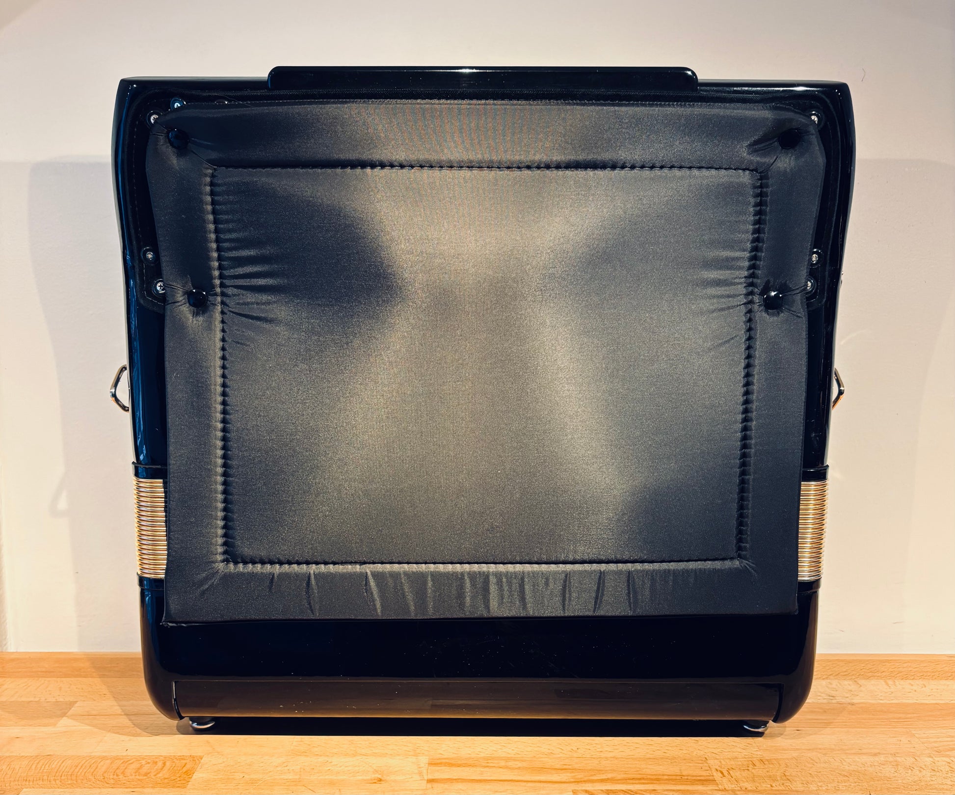 Eksklusiv BB “Ballone Burini” Gold knap harmonika i topklasse. Instrumentet har en kraftfuld og nuanceret klang med 4-koret diskant (4-8-8-16), hvor 8-16 fod ligger i cassotto for en varm og dyb tone.